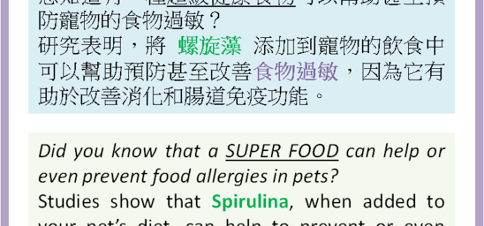 研究表明,將 螺旋藻 添加到寵物的飲食中可以幫助預防甚至改善食物過敏,因為它有助於改善消化和腸道免疫功能。