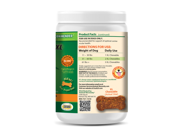 Ocu-GLO™ Soft Chew for Dogs and Cats is a blend of 12 different antioxidants that complement traditional therapy, and are formulated to protect vital cells in the eye at the DNA and protein levels from oxidative damage. This formula includes Grapeseed Extract, Lutein and Omega-3 Fatty Acids. It also includes Astaxanthin for enhanced antioxidant support! It is safe for perioperative use in dogs and cats and have a two year shelf life from date of manufacture.
